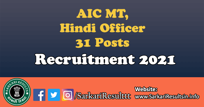 Registration are starting from November 23, 2021 and last date for the registration is December 13, 2021. There are 31 Vacancy for the AIC MT, Hindi Officer Recruitment 2021. AIC MT, Hindi Officer Pay Scale is Rs 40000 (Base). Candidates can get selection through Online Exam and Personal Interview. AIC Recruitment Job location is in All India.