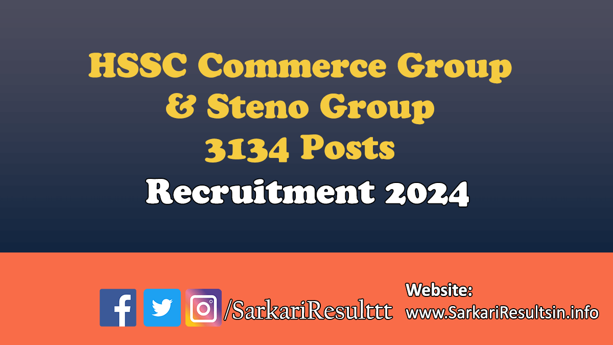 According to the Sarkari Results Info updates, Registration are starting from July 21, 2024 and last date for the registration is July 31, 2024. There are 3134 Vacancy for the HSSC Commerce Group & Steno Group Various Posts Recruitment 2024. Candidates can get selection through Written Exam. HSSC Commerce Group & Steno Group Various Posts Recruitment Job location is in All India.